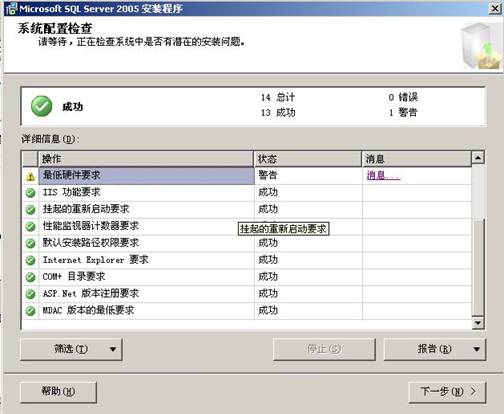3. 點(diǎn)擊下一步,系統(tǒng)開(kāi)始對(duì)系統(tǒng)配置進(jìn)行檢測(cè),(正常情況有1個(gè)警告或者沒(méi)有警告,根據(jù)電腦配置而定,這個(gè)不影響)。