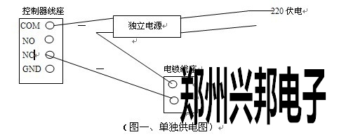 2、  鎖到控制器的連接線需采用2芯電源線,控制器到鎖距離不可以超過100米,線徑大于1.0 mm。如有需門磁檢測線則需多2芯線。(可根據(jù)現(xiàn)場需要定)。如果輸出12V電源有明顯降壓則可以微調(diào)電源電壓到13.6V或單獨給電鎖供電(如圖一)。