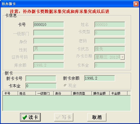 第三步:將一張未發(fā)行過的卡放到讀卡器上,在軟件卡管理——補(bǔ)辦新卡,在出現(xiàn)的界面中輸入要補(bǔ)辦的卡的卡號,然后按回車鍵, 在出現(xiàn)丟失卡的卡信息后,點(diǎn)擊讀卡,寫卡,這張新卡就將原來的卡補(bǔ)辦了!(如圖二)