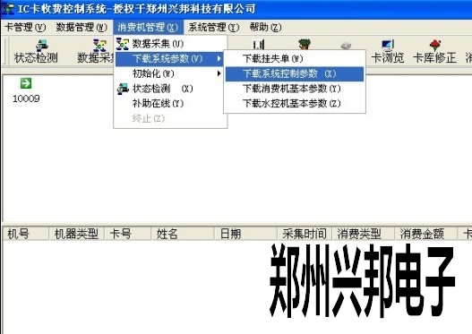具體操作步驟為:將消費機連接到通訊線上,打開一卡通系統(tǒng)確認(rèn)機器通訊正常然后選擇--消費機管理--下載系統(tǒng)參數(shù)--下載系統(tǒng)控制參數(shù)--下載消費機基本參數(shù)或者下載水控機基本參數(shù)(如下圖所示)