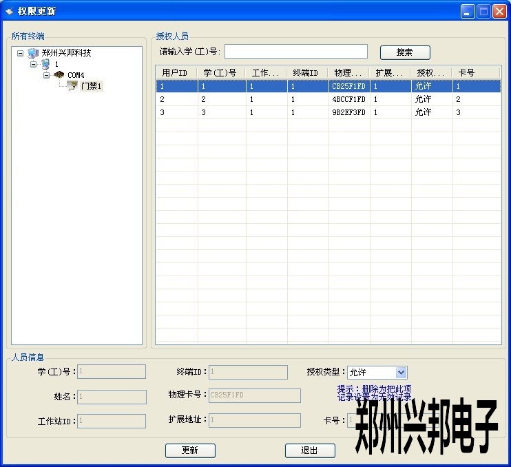 1.選擇終端,在右列表框中可顯示出該終端下的所有授權(quán)人員的名單。或者在請(qǐng)輸入學(xué)(工)號(hào)右邊的文本框中錄入所要更改權(quán)限的學(xué)工號(hào),單擊搜索按鈕可在列表中查詢出該人員的授權(quán)信息。