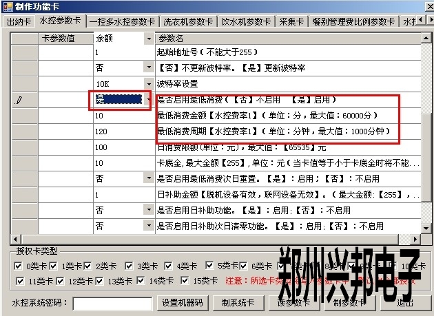 2)打開軟件 制卡中心-功能卡制作-水控參數(shù)卡中的最低消費(fèi)周期,先選擇啟用,然后輸入最低消費(fèi)金額和最低消費(fèi)周期,最低消費(fèi)金額以分為單位,最低消費(fèi)周期以分鐘為單位,設(shè)置好后點(diǎn)擊制參數(shù)卡即可;