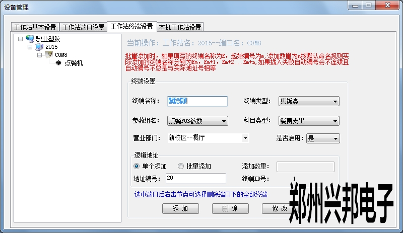 工作站終端設(shè)置:在端口地址下添加終端,進(jìn)行添加時(shí)填寫終端名稱,選擇終端類型、參數(shù)組名、科目類型、營(yíng)業(yè)部門,是否啟用選擇是,添加地址時(shí)可以選擇單個(gè)添加和批量添加。此地址編號(hào)要與機(jī)器的編號(hào)相同。進(jìn)行批量添加時(shí)填寫添加數(shù)量、地址號(hào),點(diǎn)擊添加后就可以以地址號(hào)遞增的形式添加機(jī)器。選中終端可以進(jìn)行修改和刪除操作,選擇端口右擊可以刪除端口下的所有終端。