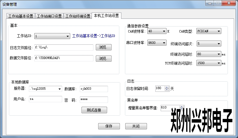 本機(jī)工作站設(shè)置:工作站ID即選擇工作站基本設(shè)置中添加工作站的ID號(hào),下面選擇存放日志文件和數(shù)據(jù)文件的地址;通訊參數(shù)設(shè)置中CAN波特率默認(rèn)為40K,串口波特率默認(rèn)為9600,此處設(shè)置不對(duì)會(huì)導(dǎo)致機(jī)器不通訊。終端訪問超次從1到100,默認(rèn)為5,終端訪問延時(shí)從10ms到6000ms,默認(rèn)為20ms,此處設(shè)置會(huì)影響監(jiān)控平臺(tái)下載參數(shù)和上傳記錄的速度,一般使用默認(rèn)值;本地?cái)?shù)據(jù)庫(kù)設(shè)置中服務(wù)器選擇數(shù)據(jù)庫(kù)2005的服務(wù)器名,數(shù)據(jù)庫(kù)填寫創(chuàng)建采集庫(kù)的數(shù)據(jù)庫(kù)名稱,用戶名sa,密碼為hnzz,設(shè)置后點(diǎn)擊測(cè)試連接,看能否連通;日志保留時(shí)間和增量黑名單警界值可以自主更改。