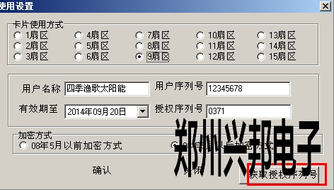 2.雙擊后出現(xiàn)下圖所示的界面,點擊該界面右下角的【獲取授權(quán)序列號】按鈕,即可讀出當前數(shù)據(jù)庫中的設(shè)置,包括 使用扇區(qū)、用戶名稱、用戶序列號、授權(quán)序列號、加密方式