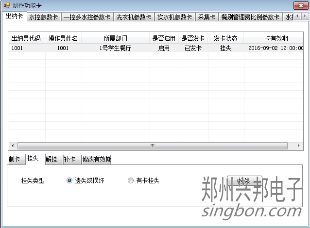 客戶使用的我們的互聯(lián)網(wǎng)一卡通食堂售飯機(jī)軟件,不小心把出納卡制成員工卡使用了,遇到這種情況,(1)用超級管理員身份登錄軟件,在軟件的制卡中心-功能卡制作-出納卡頁面里選中之前的出納員信息,選擇掛失(掛失類型選擇遺失或損壞),點擊右邊的掛失把原來的出納員賬號掛失;