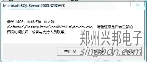 客戶使用我們的互聯(lián)網(wǎng)一卡通食堂售飯機(jī),自己安裝SQL2005數(shù)據(jù)庫沒裝成功,讓我們遠(yuǎn)程再重裝一次,在控制面板里卸載后并刪除之前的安裝文件,又重新安裝時(shí)提示:錯(cuò)誤1406。未能將值 寫入項(xiàng)\Software\Classes\.htm\OpenWithList\devenv.exe。請驗(yàn)證您是否有足夠的權(quán)限訪問該項(xiàng),或者與支持人員聯(lián)系。這時(shí)該怎樣解決呢?