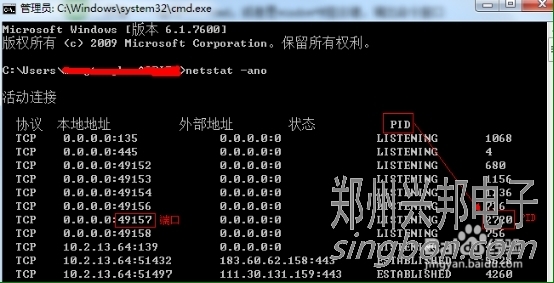 查看被占用端口對應(yīng)的PID,輸入命令:netstat -aon|findstr "49157",回車,記下最后一位數(shù)字,即PID,這里是2720