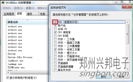 則我們點(diǎn)擊查看--->選擇列,將PID(進(jìn)程標(biāo)示符)前面的勾打上,點(diǎn)擊確定