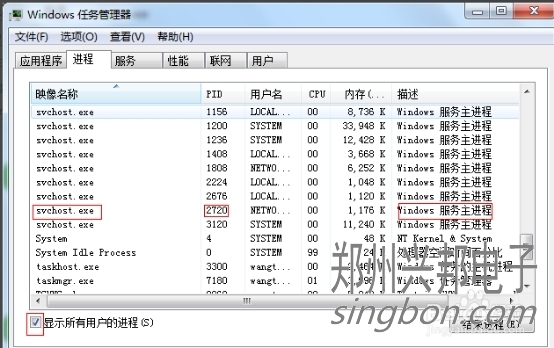 這樣我們就看到了PID這一列標(biāo)識,看一下2720對應(yīng)的進(jìn)程是誰,如果沒有,我們把下面的顯示所有用戶的進(jìn)程前面的勾打上,就可以看到了,映像名稱是svchost.exe,描述是,Windows的主進(jìn)程,與上面命令查看的完全一致。